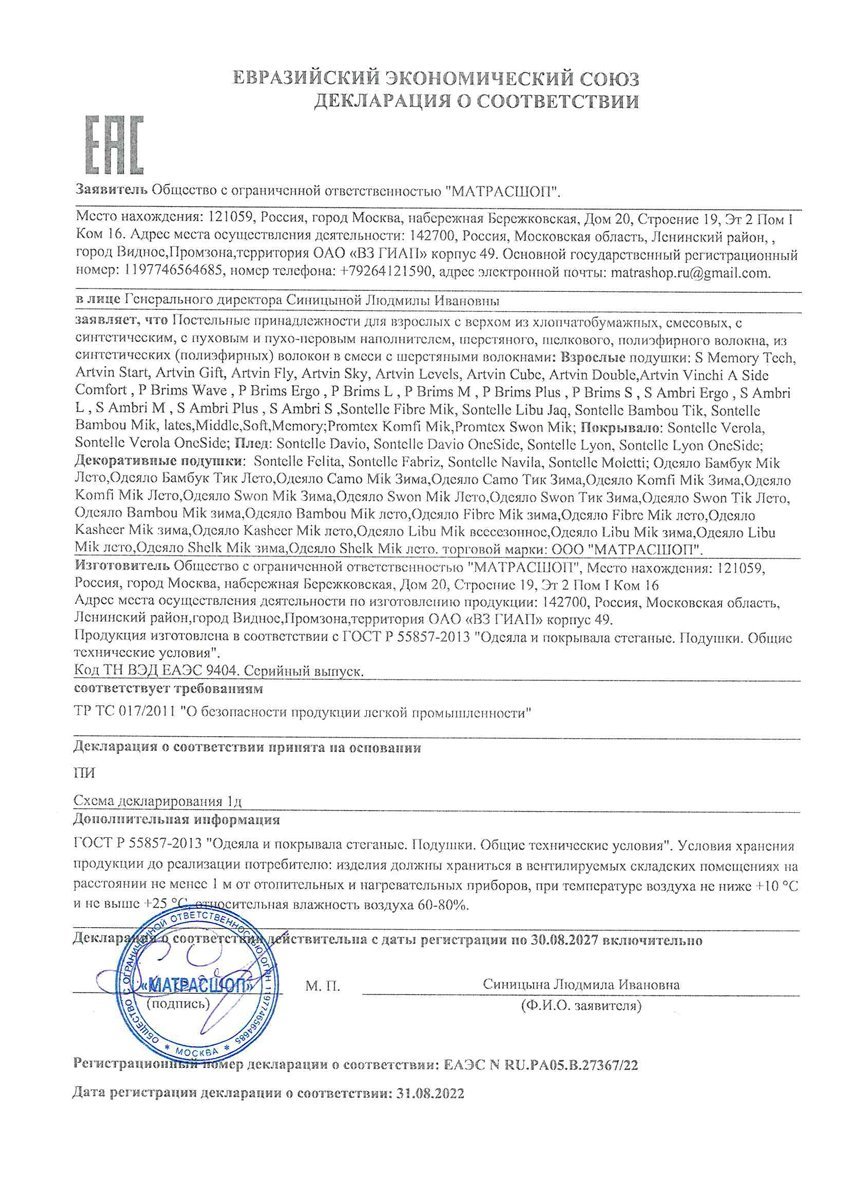 - Подушки: Bambou, Fibre, Kasheer, Libu, Shelk — 12 месяцев;