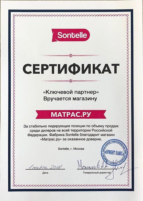 Матрас.ру — официальный дилер компании Sontelle, которая даёт фирменную гарантию и несёт полную ответственность за качество продукции, размещенной на витрине нашего интернет-магазина.