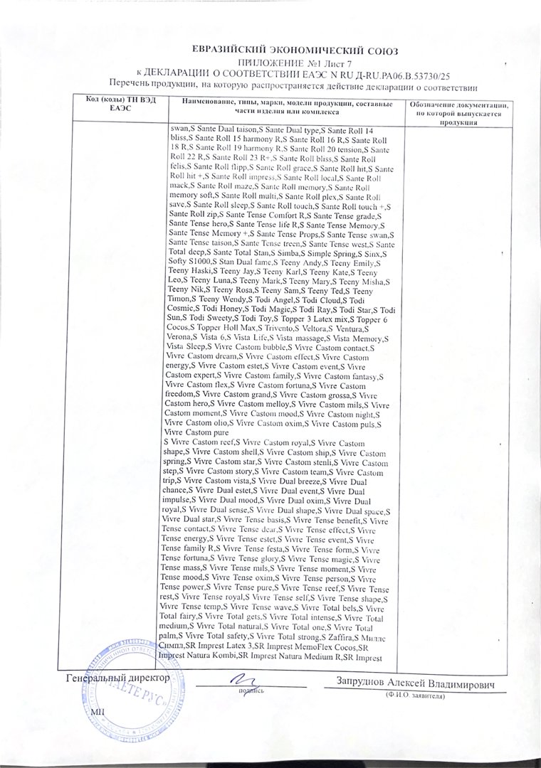 Расширенная гарантия на верхние обивочные материалы, пружины, производственные дефекты пен распространяется на серии Libre, Vivre, Sante при единовременной покупке матраса с защитным наматрасником Кеар WP Zipp или Кеар WP Сайд и составляет 10 лет.
