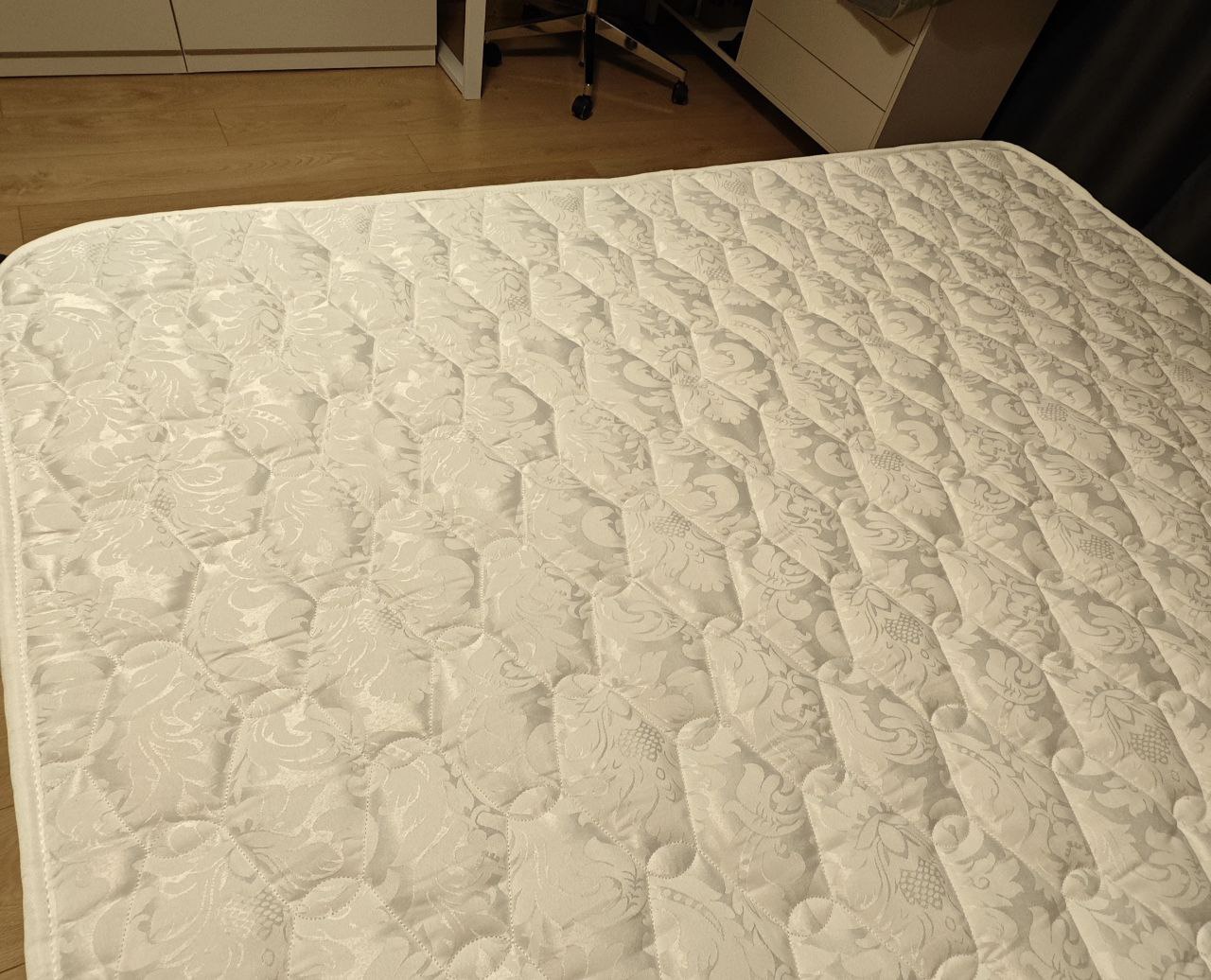 Чехол сшит из хлопкового жаккарда, простеганного на синтепоне плотностью 300 г/м². Объемная стежка придает покрытию дополнительную мягкость.